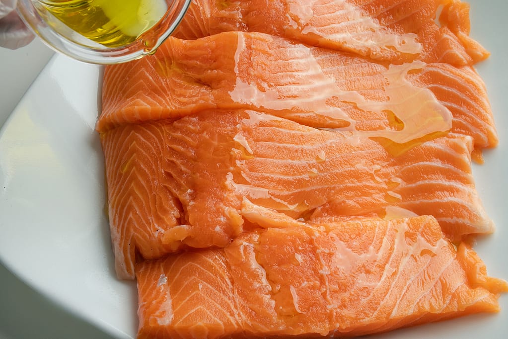 - Oil + season. Lightly coat salmon with olive oil, then press seasoning onto the flesh side (and edges).