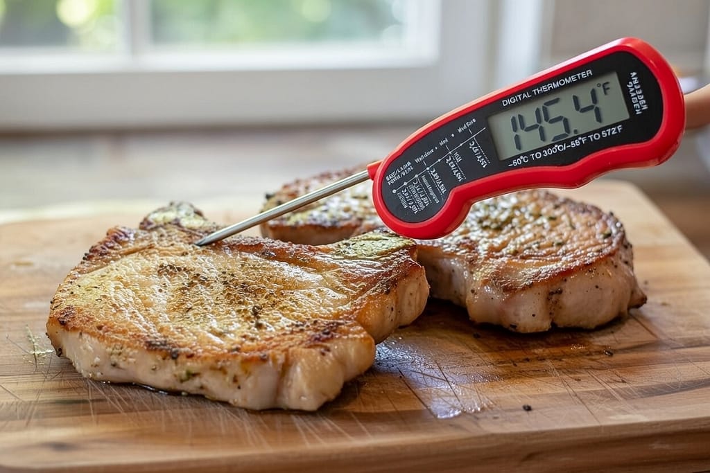 Always rest pork chops for 3–5 minutes after cooking. The temperature will rise slightly as they rest.