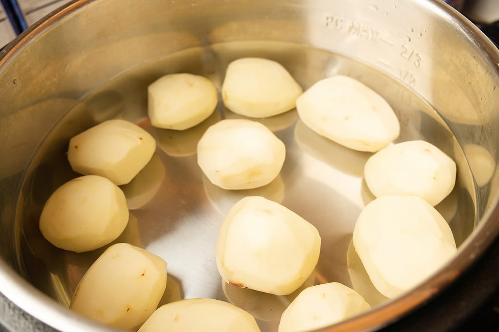 Add about 1 cup water to the Instant Pot. Add the 11 red potatoes, close the lid, and cook on High Pressure for 12 minutes.