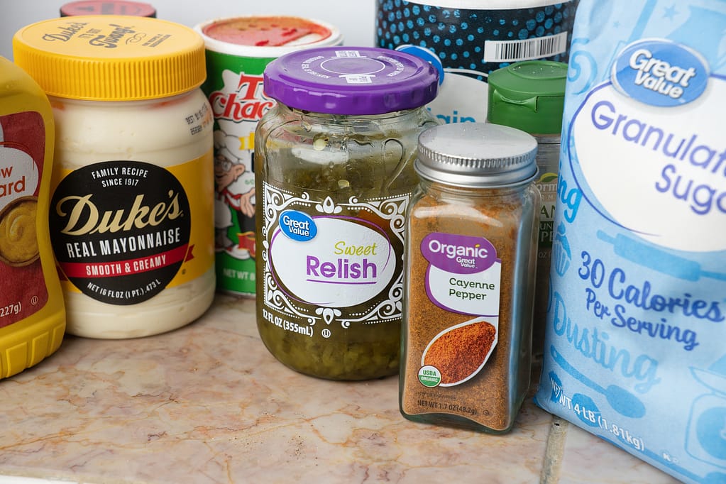 - Make the dressing. In a small bowl, mix mayo, mustard, relish, salt, 1 teaspoon sugar, 1 teaspoon Tony’s, and 1/8 teaspoon cayenne (if using).