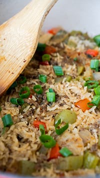 20 minutes before serving, add the remaining beef broth and stir in the rice.