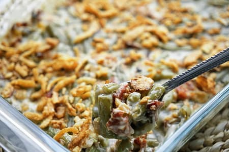- Stir in green beans, ½ cup fried onions, and most of the bacon.